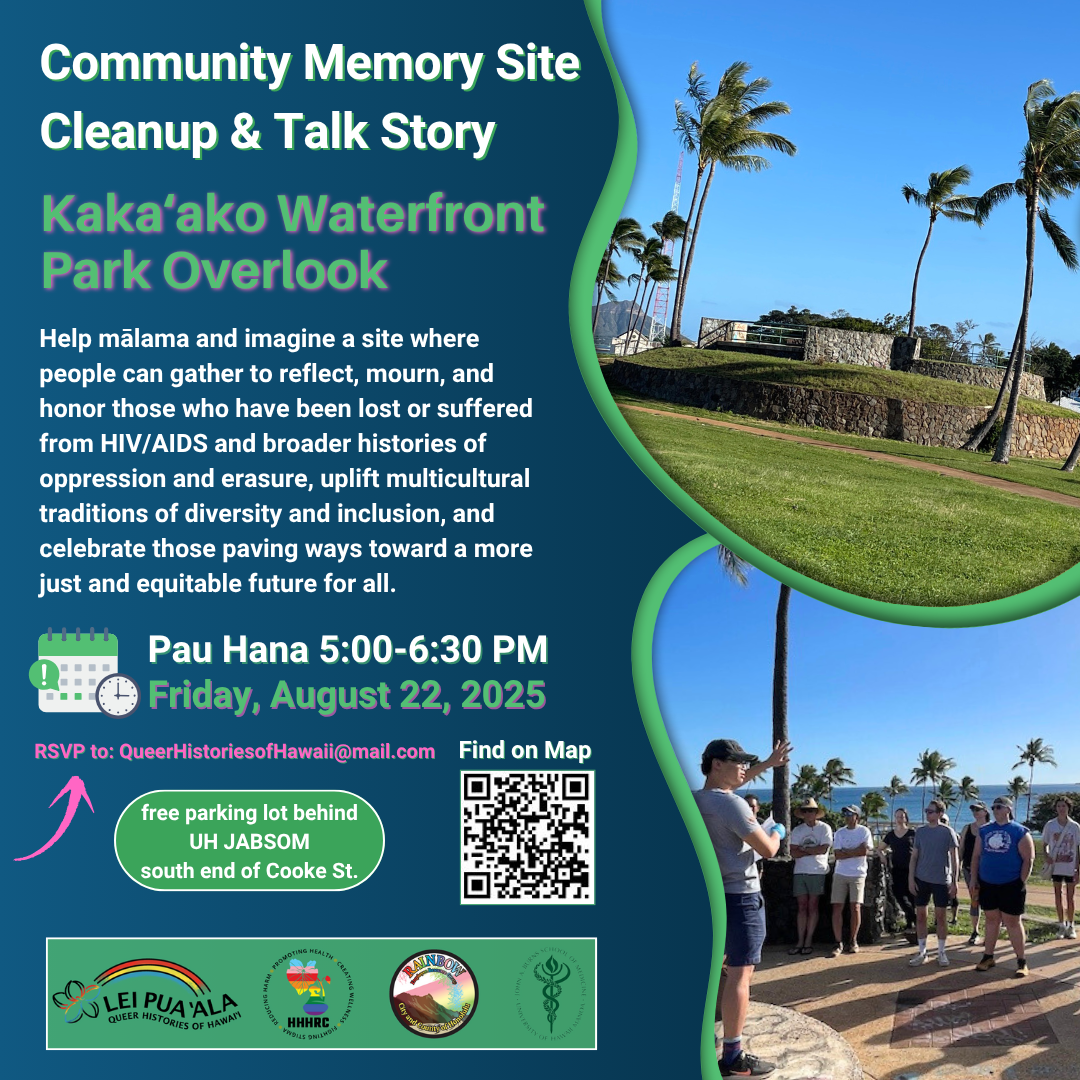 Kakaʻako Waterfront Park Cooke & Kelikoi Streets, Honolulu, HI, United StatesHelp mālama and imagine a site where we can gather to reflect, morn, and honor those who have been lost or suffered from HIV/AIDS and other forms of oppression, uplift … Continue reading AIDS Memorial and Community Memory Site Pau Hana