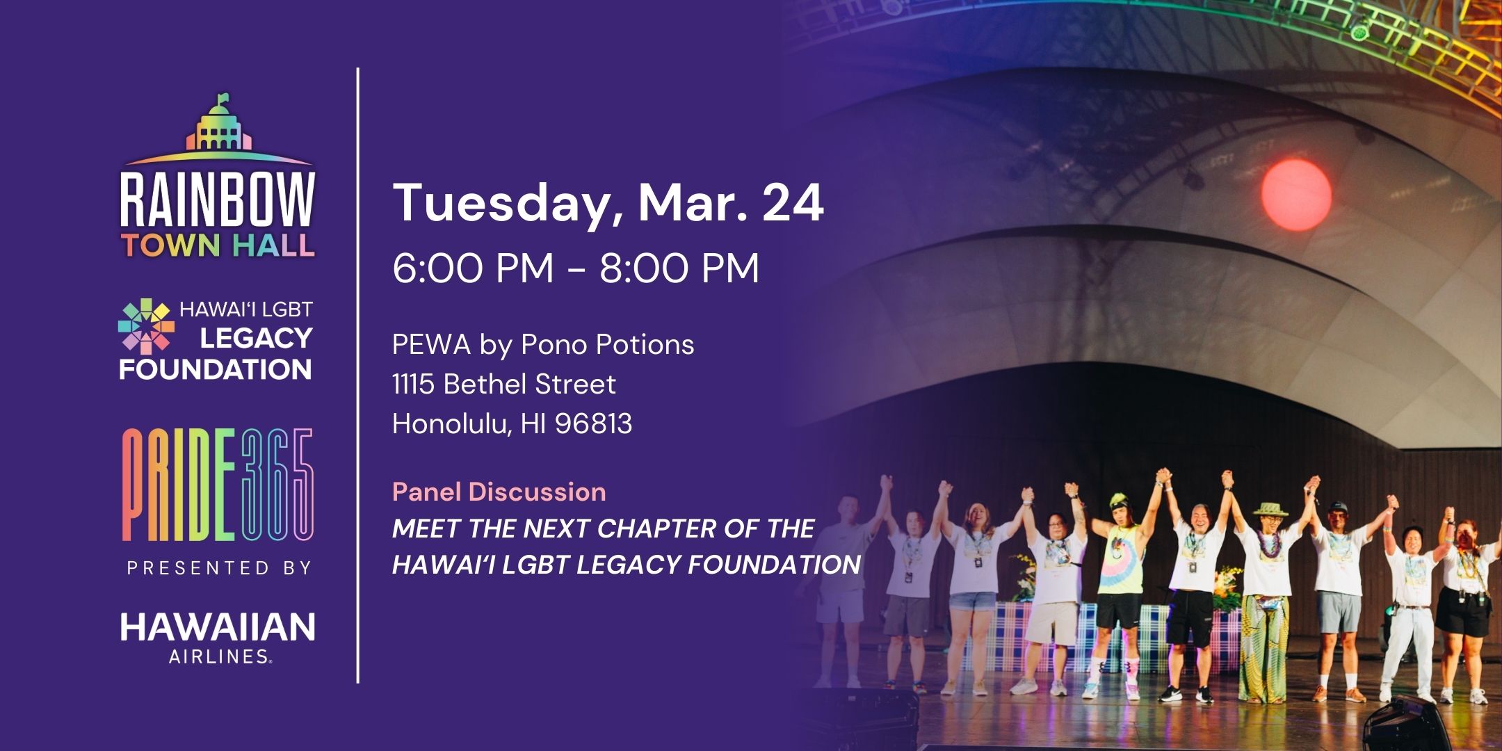 PEWA by Pono Potions 1115 Bethel St., Honolulu, HI, United StatesA community gathering to hear what’s ahead for Hawai‘i LGBT Legacy Foundation while honoring the programs and people that brought us here. The Rainbow Town Hall is an opportunity for … Continue reading Rainbow Town Hall: Meet the Next Chapter of HLLF
