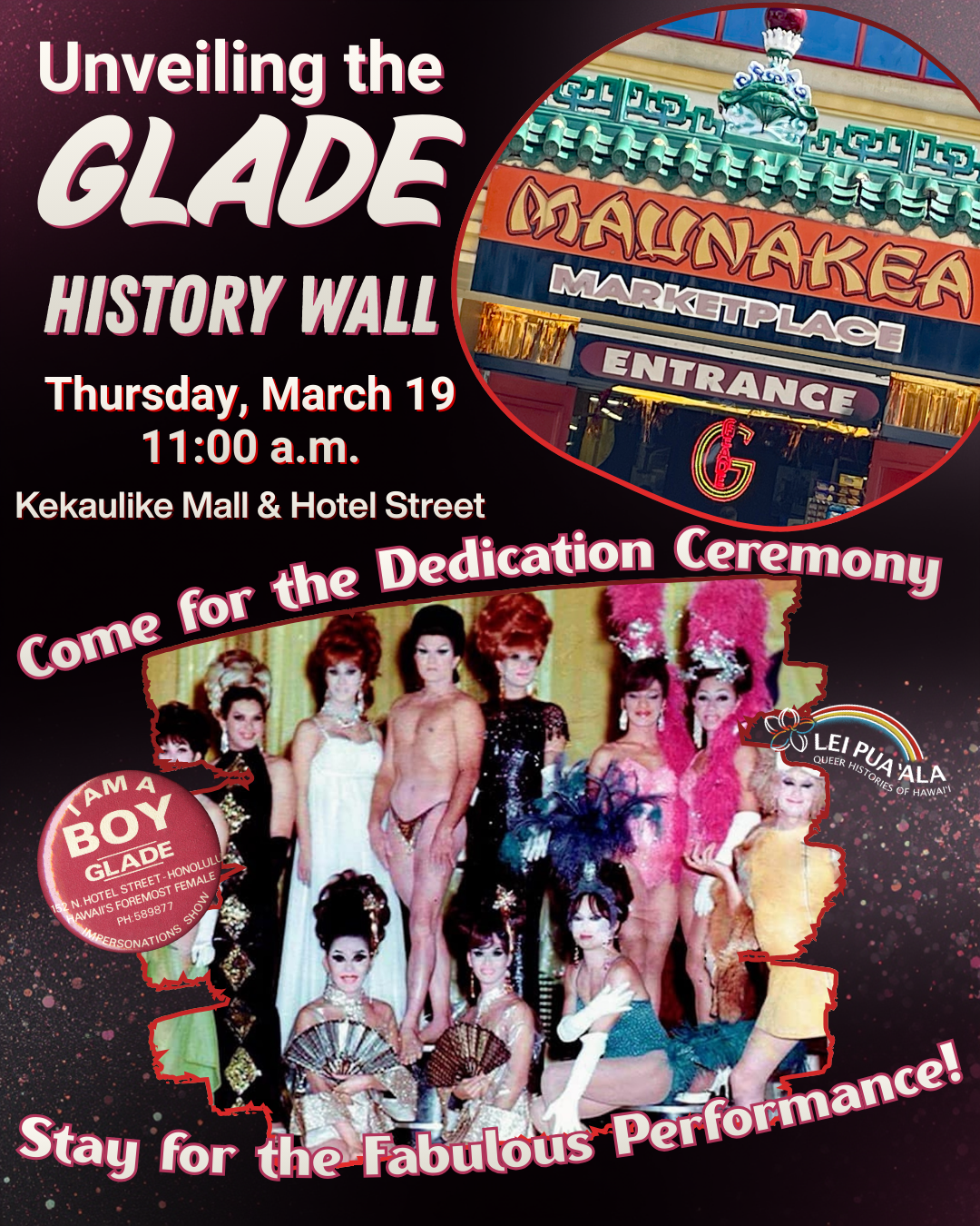 Maunakea Marketplace 152 N. Hotel St, Honolulu, HI, United StatesThe Glade Show Club was a celebrated nightclub in Chinatown famous in the 1960s for its “Boys Will Be Girls” revue and as a place of safety and refuge for … Continue reading Glade Wall Unveiling and Legends Show