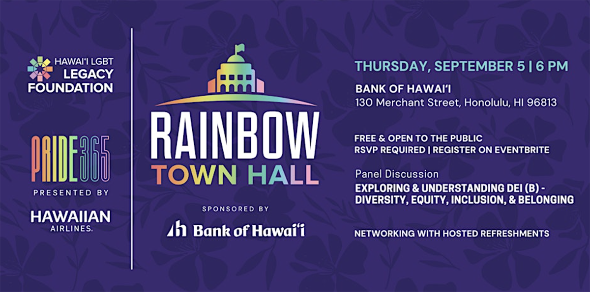 Join the Hawaiʻi LGBT Legacy Foudation for their next Rainbow Town Hall and learn more about Diversity, Equity, Inclusion, and Belonging initiatives. In collaboration with Bank Of Hawaiʻi, this event will bring together some of the most committed professionals to share their experiences and insight on how they include DEI(B) into their daily lives and … Continue reading Rainbow Town Hall – Exploring & Understanding DEI (B)