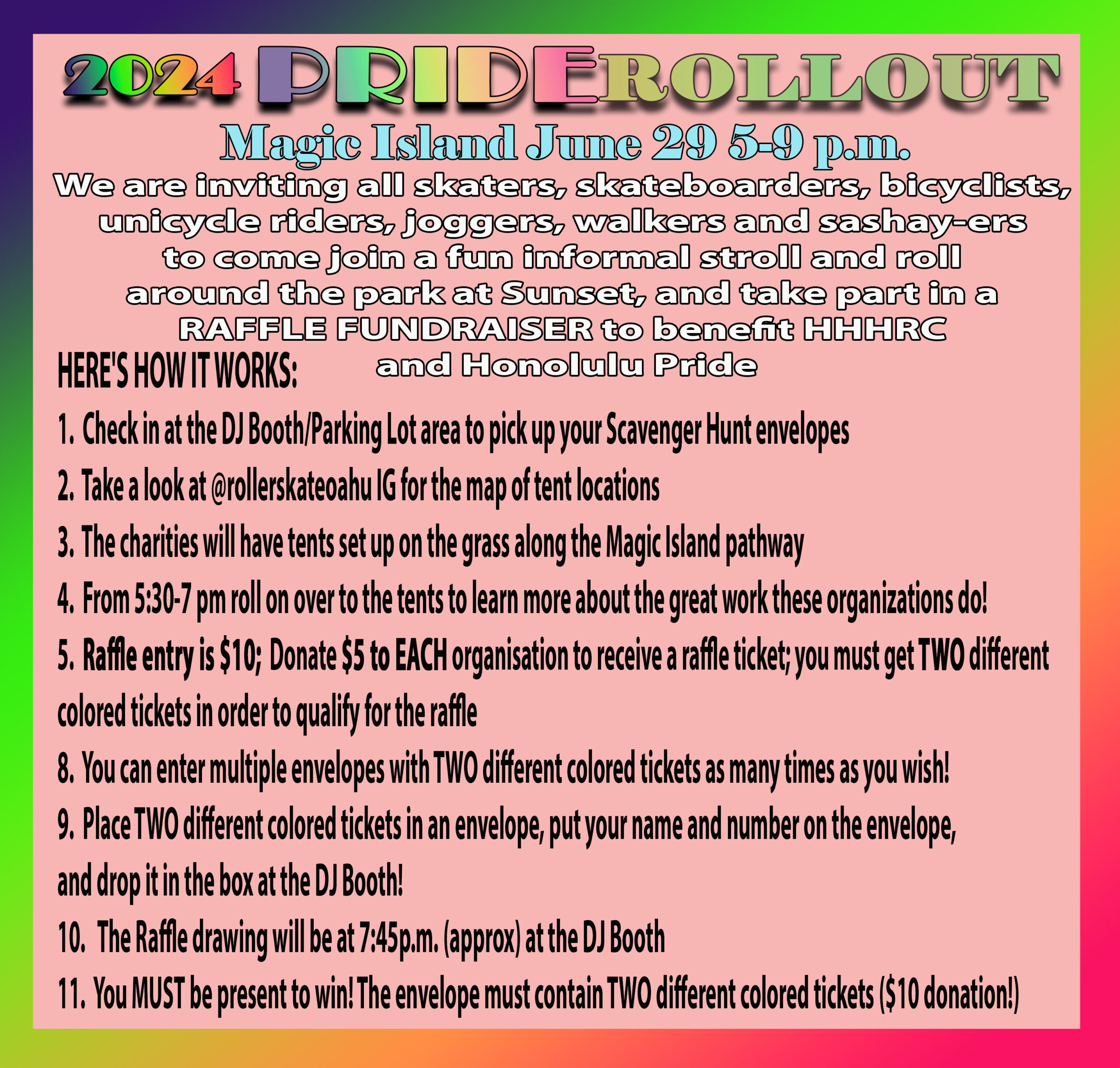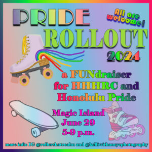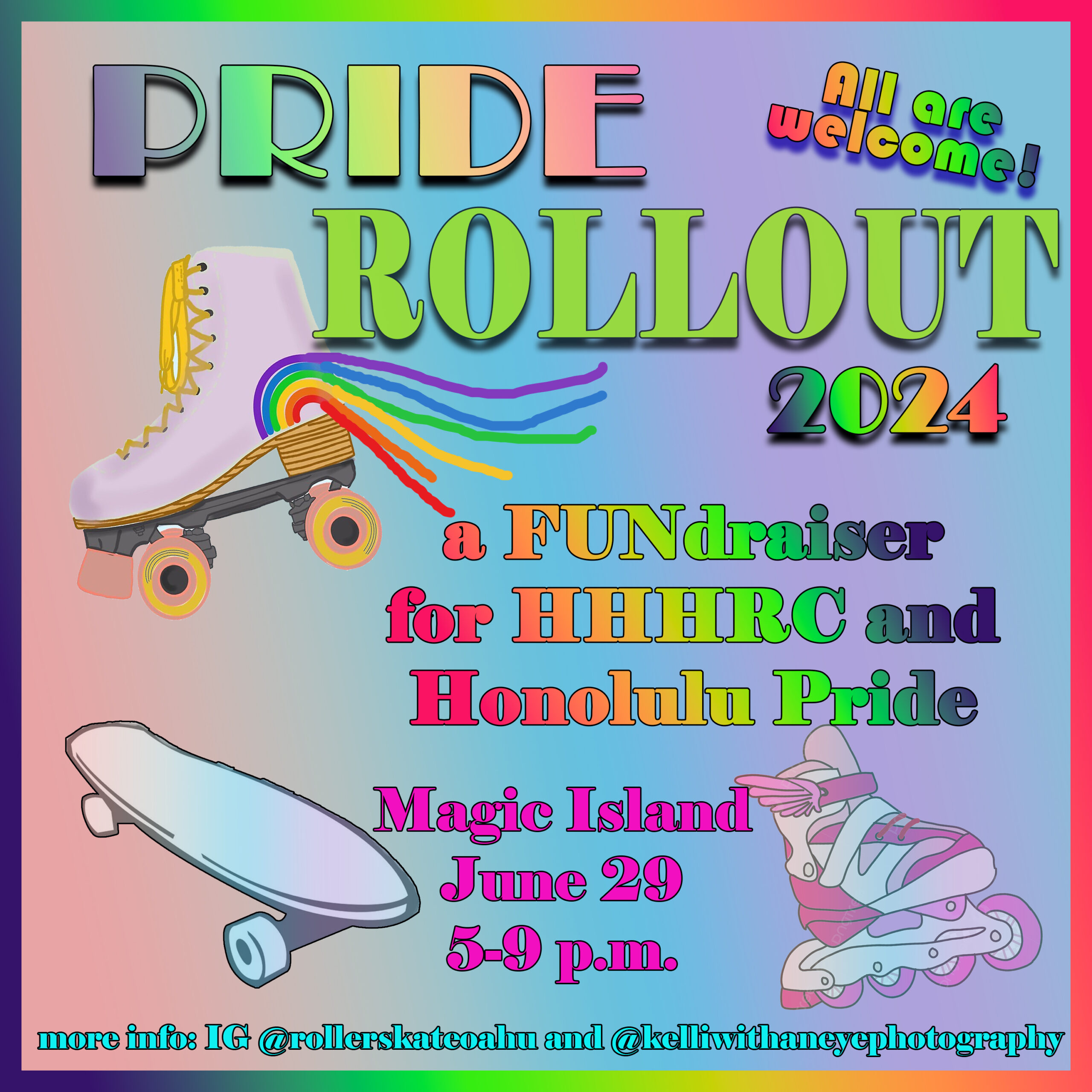 Roller Skate Oʻahu and Kelli With An Eye Photography are celebrating National Pride Month with their FREE annual Pride Rollout on June 29 from 5pm-9pm at Magic Island. Skaters, skateboarders, bicyclists, unicyle riders, joggers, walkers and sashay-ers are all invited to join a fun informal stroll and roll around the park at sunset, and take part in a raffle fundraiser to benefit the Hawaiʻi Health & Harm Reduction Center and Honolulu Pride.