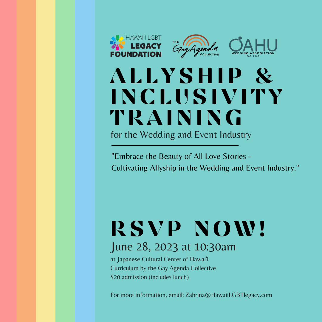 Join us on June 28 for a special Hawaiʻi LGBT Legacy Foundation Rainbow Town Hall exploring diversity, inclusivity and allyship in the weddings and events industry.  In partnership with the Oʻahu Wedding Association and The Gay Agenda Collective, this RTH is part of a series of community gatherings, resource fairs and trainings focusing on issues facing the MVPFAFF/LGBTQIA+ community.