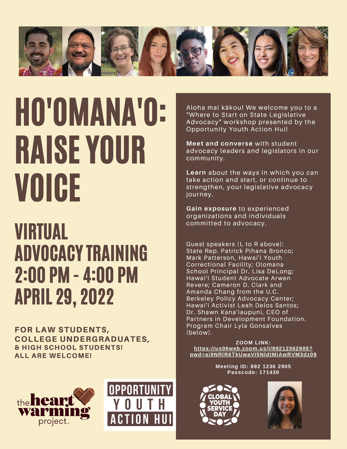 Planned by Opportunity Youth Action Hui policy internship participants and advocates Lyla Gonsalves (Chaminade University) and Leah Delos Santos (University of Hawai’i) after noting that few testifiers at the state capitol are students and that many students may not know that their voice is needed on policy matters.